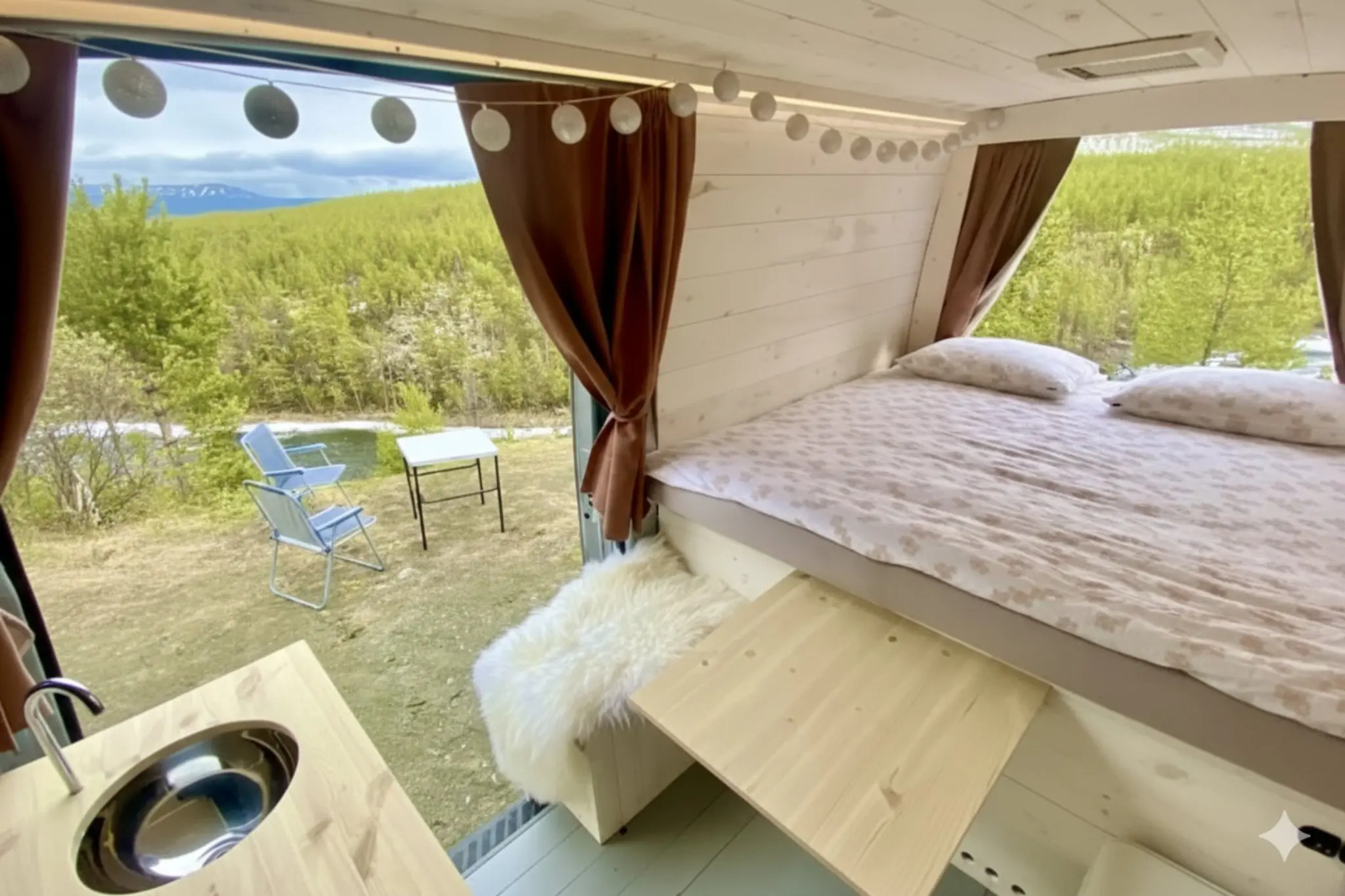 - Van aménagé compact (2 pers.) : à partir de 920 € par personne avec Lofoten Nomads, tout inclus. Lit, cuisine, matériel — tout est là. Facile à conduire et à garer dans les petits villages.